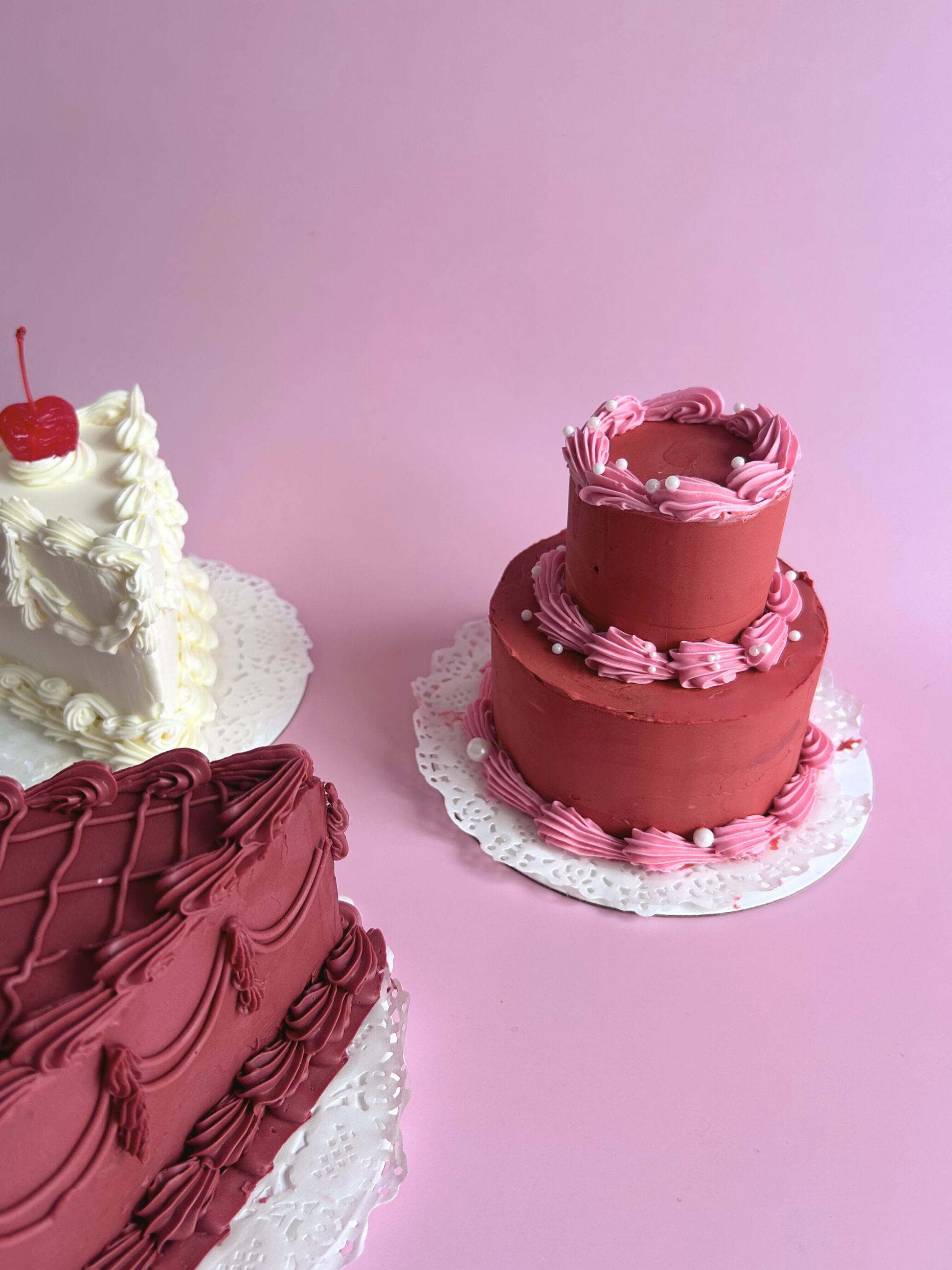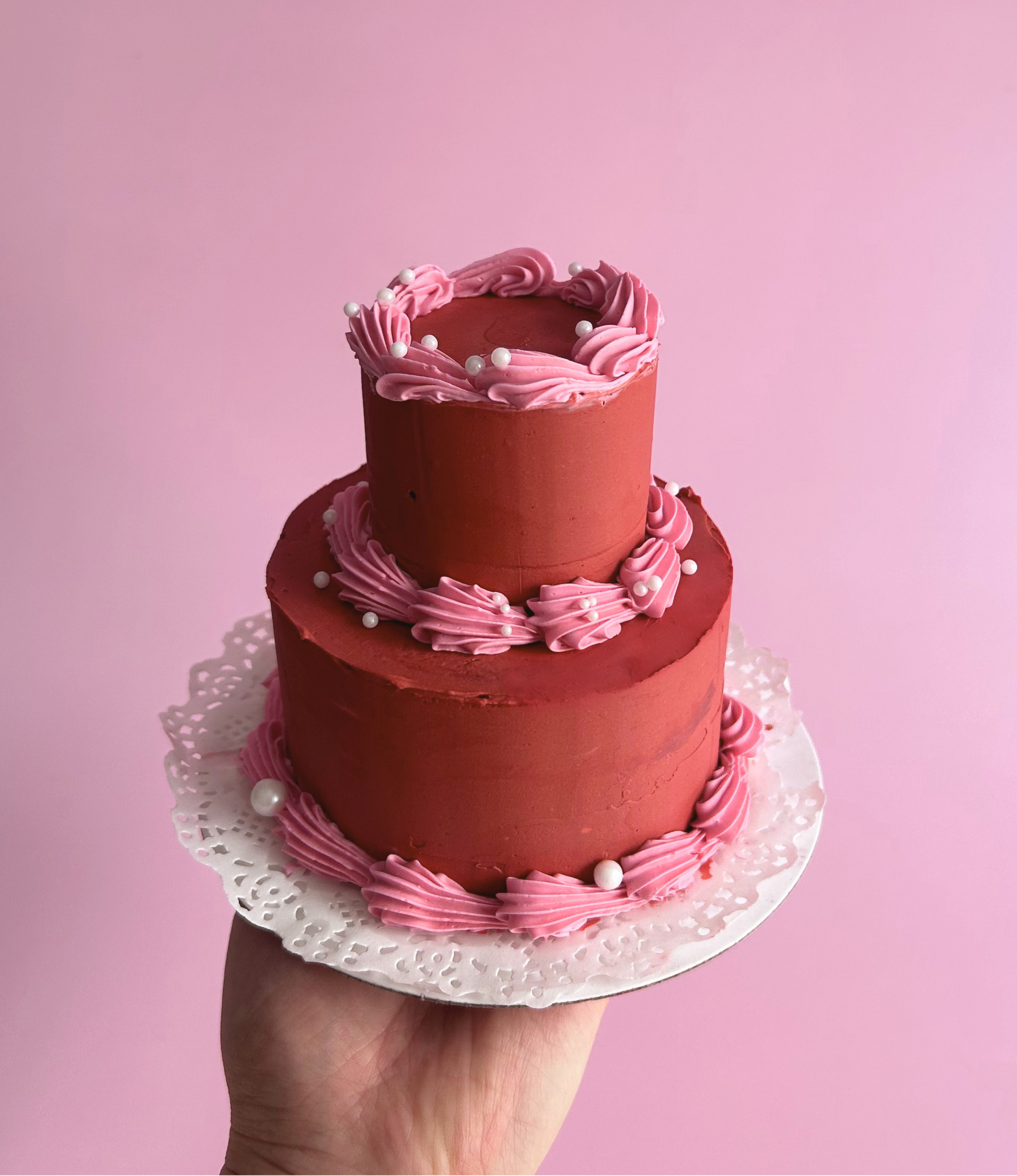 A mini two-tier cake with our classic vintage piping, designed for Valentine’s Day. Serves 2-4. Customise with your choice of colours and toppers.